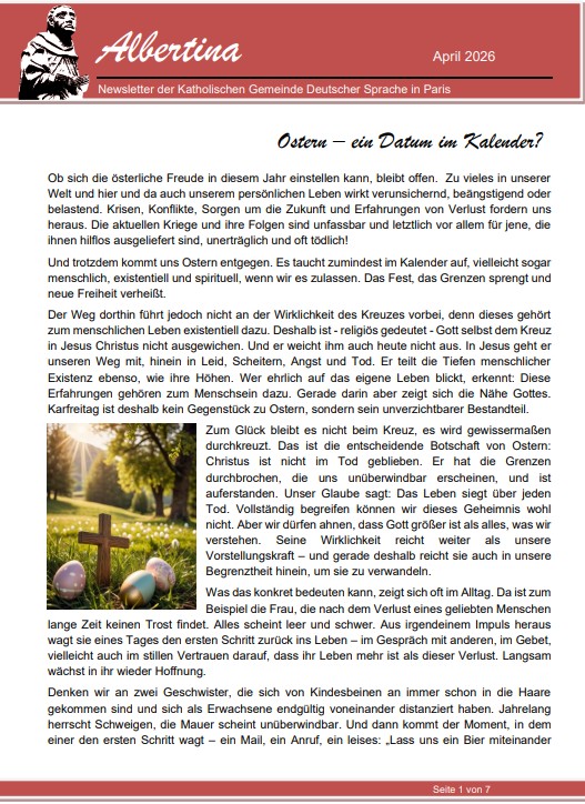 … ist unser elektronischer Monatsbrief, der einmal im Monat erscheint, Sie über aktuelle Termine informiert und auf besondere Veranstaltungen hinweist. Er wird per E-Mail an alle eingeschriebenen Adressen versandt. Wenn Sie unseren regelmäßigen Monatsbrief abonnieren möchten, senden Sie einfach Ihre E-Mail-Adresse an: info@kgparis.eu