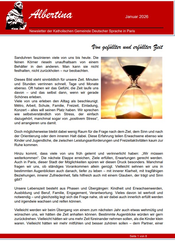 … ist unser elektronischer Monatsbrief, der einmal im Monat erscheint, Sie über aktuelle Termine informiert und auf besondere Veranstaltungen hinweist. Er wird per E-Mail an alle eingeschriebenen Adressen versandt. Wenn Sie unseren regelmäßigen Monatsbrief abonnieren möchten, senden Sie einfach Ihre E-Mail-Adresse an: info@kgparis.eu